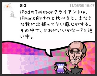 - iPadのTwitterクライアントは、iPhone向けのと比べると、まだまだ数が出揃ってない感じがする。その中で、どれがいいかなー?と迷い中。 #