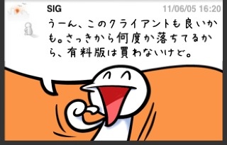 - うーん、このクライアントも良いかも。さっきから何度か落ちてるから、有料版は買わないけど。 #