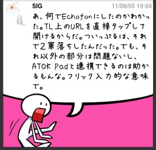 - あ、何でEchofonにしたのかわかった。TL上のURLを直接タップして開けるからだ。ついっぷるは、それで2軍落ちしたんだった。でも、それ以外の部分は問題ないし、ATOK Padと連携できるのは助かるもんな。フリック入力的な意味で。 #