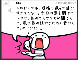 - それにしても、現場と違って静かすぎてだなー。今日は窓を開けてるけど、鳥のさえずりとか聞こえて、風に気の枝がざわめく音がして。のどかだー。 #