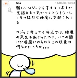 - 難しいロジックを考える→考えが煮詰まる→気がつくとウトウトしてる→猛烈な睡魔に支配されてる