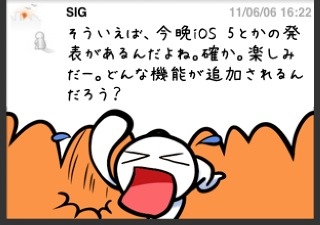 - そういえば、今晩iOS 5とかの発表があるんだよね。確か。楽しみだー。どんな機能が追加されるんだろう? #