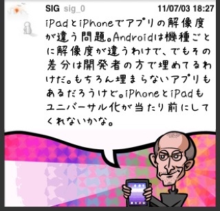 - iPadとiPhoneでアプリの解像度が違う問題。Androidは機種ごとに解像度が違うわけで、でもその差分は開発者の方で埋めてるわけだ。もちろん埋まらないアプリもあるだろうけど。iPhoneとiPadもユニバーサル化が当たり前にしてくれないかな。 #