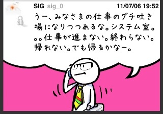 - うー、みなさまの仕事のグチ吐き場になりつつあるな。システム室。。。仕事が進まない。終わらない。帰れない。でも帰るかなー。 #