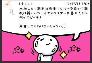 - 出社したら朝礼の当番でした→今日から朝礼は新しいやり方でやります→当番の人から何かスピーチを