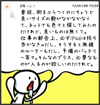 仕事の都合上、必ずiPadは持ち歩かなきゃだし、そうすると無線のルーターもだし、予備のバッテリー等々。そんなのプラス、必要なものが入るのが欲しいのだけれど。 # - というわけで、ハンズ来て、あれこれ選んだ結果、ちょうど良いくらいのサイズ&お値段のものを見つけて購入。 #